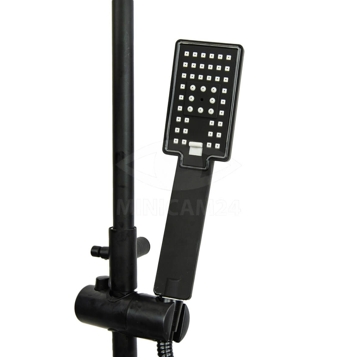 Душевой комплект с тропическим душем Quadro черный матовый предназначен для ванной или для душевой кабины в квартире или частном доме. Система тропический душ монтируется на стену и выглядит как металлическая стойка с матовым покрытием, оснащенная небольшим пластиковым контейнером для шампуней, мыла, мочалки и других предметов. Высота лейки достигает 225 мм. Верхний душ имеет квадратную форму и оснащен регулятором струи в трех режимах, при которых вода распыляется по-разному. Смеситель с изливом поворотным управляется рычажным способом. В комплект входят душевая система, штанга, пластиковая емкость и крепежные элементы.
